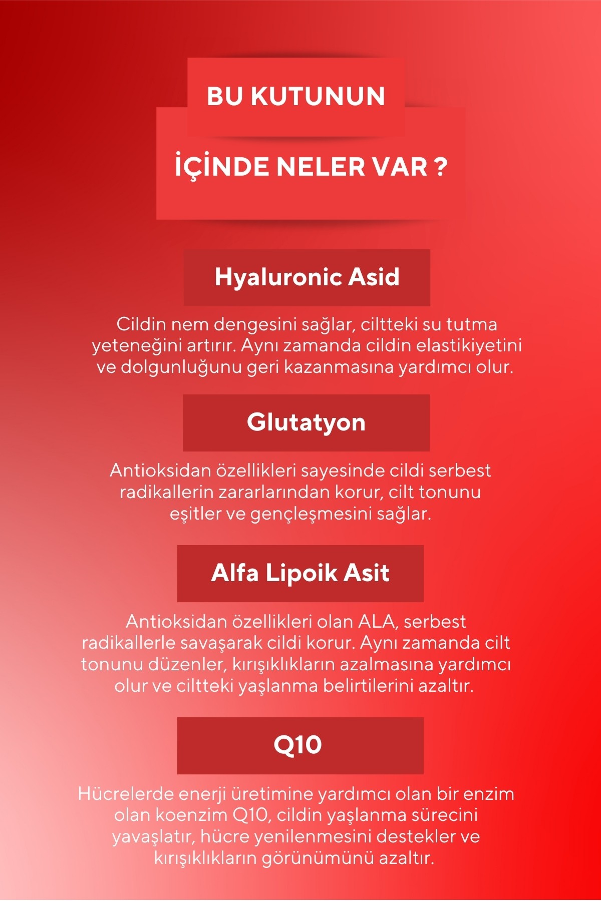 Başlıca Etken Maddeler;-Hyaluronic Asid Cildin nem dengesini sağlar, ciltteki su tutma yeteneğini artırır. Aynı zamanda cildin elastikiyetini ve dolgunluğunu geri kazanmasına yardımcı olur.;- Glutatyon: Antioksidan özellikleri sayesinde cildi serbest radikallerin zararlarından korur, cilt tonunu eşitler ve gençleşmesini sağlar.;-Q10 Hücrelerde enerji üretimine yardımcı olan bir enzim olan koenzim Q10, cildin yaşlanma sürecini yavaşlatır, hücre yenilenmesini destekler ve kırışıklıkların görünümünü azaltır.;-ALA ALA (AlfaLipoik Asit) Antioksidan özellikleri olan ALA, serbest radikallerle savaşarak cildi korur. Aynı zamanda cilt tonunu düzenler, kırışıklıkların azalmasına yardımcı olur ve ciltteki yaşlanma belirtilerini azaltır. Vitamin C Kolajen üretimi için önemli olan vitamin C, cilt elastikiyetini artırır, cilt tonunu düzenler ve kırışıklıkların görünümünü azaltır.;Kullanım Şekli Tok karnına günde 2 adet çiğneyerek kullanmanızı öneriyoruz. İster aynı anda, isterseniz 1 adet sabah, 1 adet akşam şeklinde tüketebilirsiniz...;-FDA onaylı üründür.;-Helal sertifikalıdır.