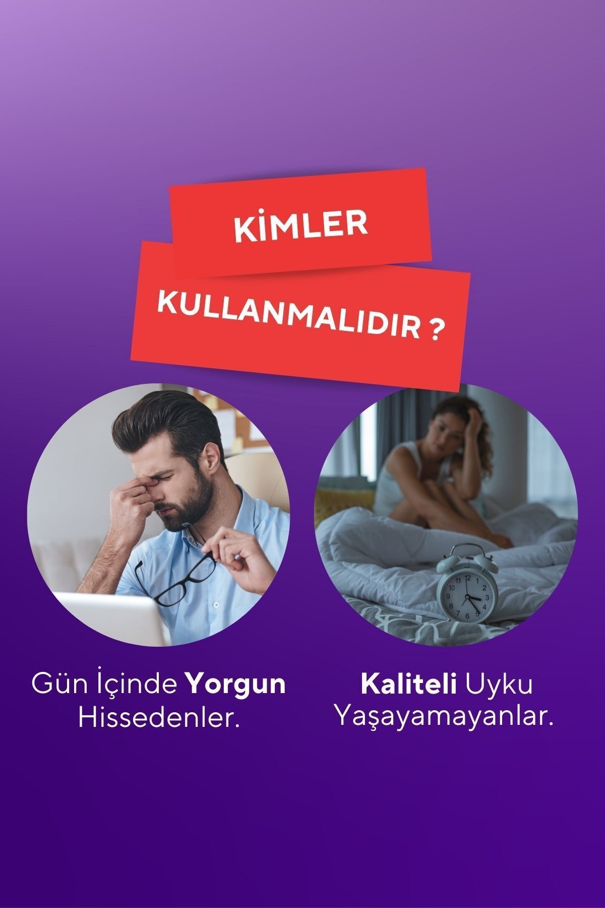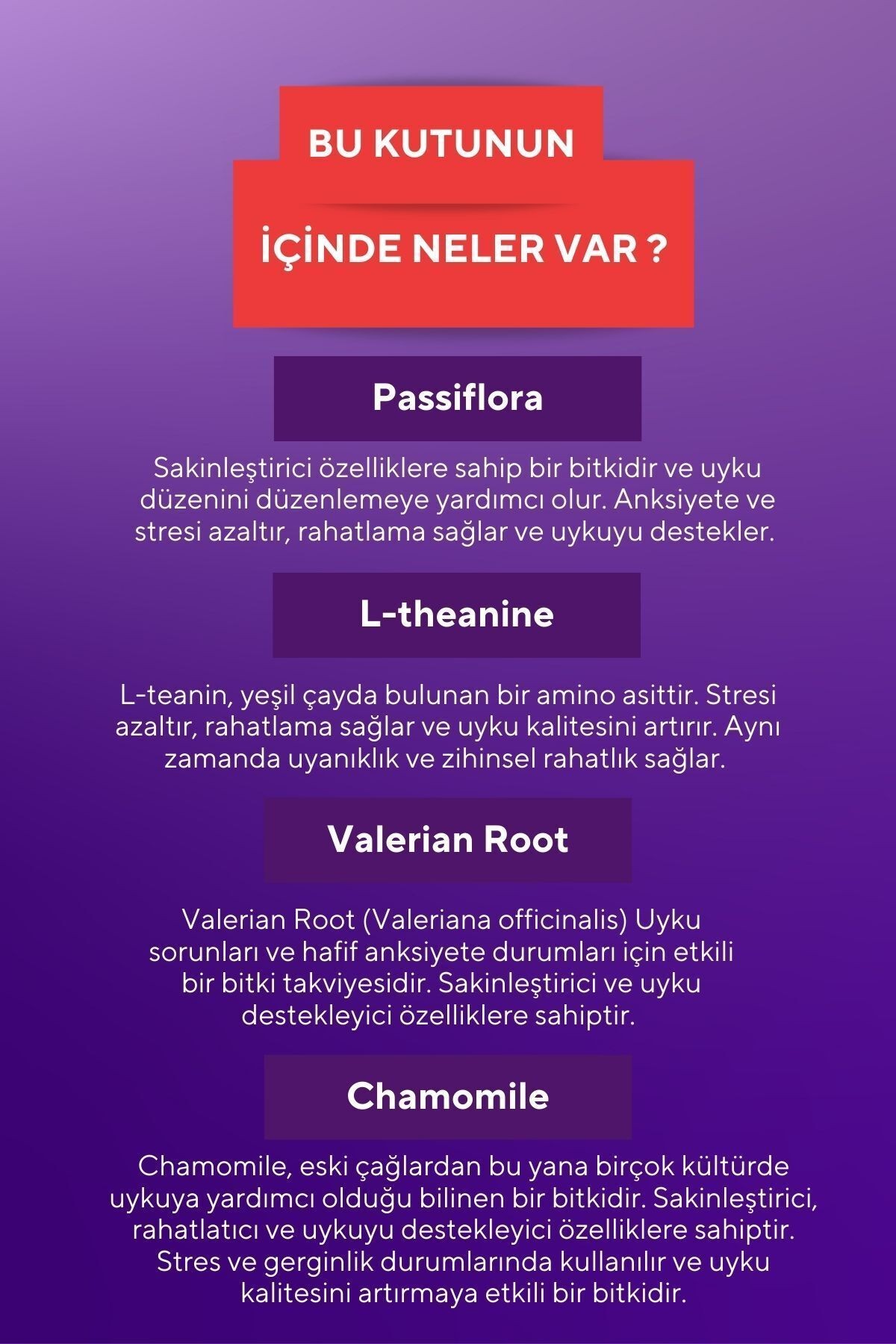 -Passiflora: Sakinleştirici özelliklere sahip bir bitkidir ve uyku düzenini düzenlemeye yardımcı olur. Anksiyete ve stresi azaltır, rahatlama sağlar ve uykuyu destekler.;-L-theanine: L-teanin, yeşil çayda bulunan bir amino asittir. Stresi azaltır, rahatlama sağlanmasına ve uyku kalitesinin artmasına yardımcı olur. Aynı zamanda uyanıklık ve zihinsel rahatlık sağlanmasına destek olur.;-ValerianRoot: Uyku sorunları ve hafif anksiyete durumları için etkili bir bitki takviyesidir. Sakinleştirici ve uyku destekleyici özelliklere sahiptir.;-Chamomile: Chamomile, eski çağlardan bu yana birçok kültürde uykuya yardımcı olduğu bilinen bir bitkidir. Sakinleştirici, rahatlatıcı ve uykuyu destekleyici özelliklere sahiptir. Stres ve gerginlik durumlarında kullanılır ve uyku kalitesini artırmaya etkili bir bitkidir.;-Kullanım Şekli: Yetişkinler için uykuya geçmeden yarım saat önce 2 adet gummy tüketmeniz yeterli olacaktır. Sonrasında TV, telefon gibi ışıklı cihazlara bakılmaması önerilir.;-Helal Sertifikalıdır.